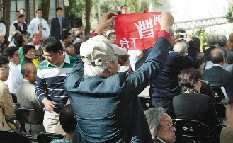 陳水扁致詞時,有一位老伯伯拿著紅布條,大喊“阿扁下臺”,當(dāng)安全人員上前時,老伯伯雖高呼“人權(quán)、人權(quán)”,但仍被架出會場。
