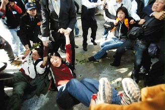 保護樂生團體也向陳水扁表達訴求,遭警方強制驅(qū)離。(臺灣《聯(lián)合晚報》圖片)