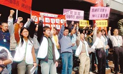傳聞臺(tái)灣廣電基金執(zhí)行長(zhǎng)林育卉是華視新總經(jīng)理人選之一,華視工會(huì)12日在公司外廣場(chǎng)抗議,表達(dá)拒絕政治黑手伸入公廣集團(tuán)高層人事的立場(chǎng)。臺(tái)灣《中國(guó)時(shí)報(bào)》粘耿豪攝