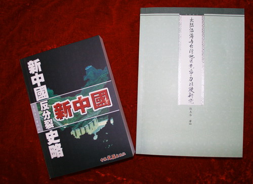 《大陸沿海與臺灣地區(qū)競爭力比較研究》和《新中國反分裂史略》書影(來源:北京聯(lián)合大學臺研院網(wǎng)站 攝影:崔國輝)