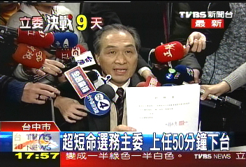 中國臺灣網(wǎng)1月4日消息 據(jù)臺灣TVBS報道,臺中市選舉委員會新任代理主委薛秋發(fā)因涉及賭博案遭起訴,昨天下午開會請辭。薛秋發(fā)從上任到辭職僅50分鐘,創(chuàng)選委會主委任職時間最短記錄。臺當(dāng)局“行政院”昨晚召開會議,指派無黨籍人士、原臺中市選委會委員蔡壽男接任臺中市選委會主委一職。
