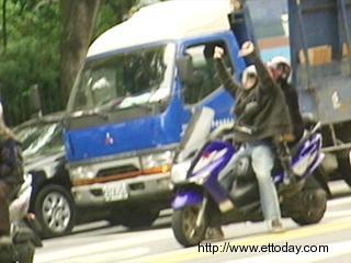 陳水扁陪綠營“立委”參選人在臺北市掃街拜票,坐在摩托車上的騎士比出倒扁手勢。(東森新聞圖)