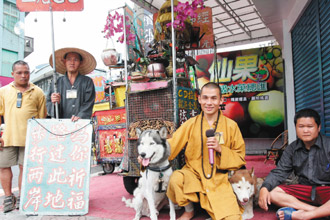 涉嫌性侵的姚姓和尚(右二)6年來(lái)帶著3名智障徒弟和流浪狗,徒步島內(nèi)各縣市販賣佛經(jīng)光盤。(聯(lián)合報(bào)圖)