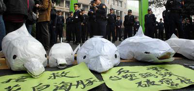 由臺灣生態(tài)學(xué)會、福爾摩莎鯨保育研究小組、彰化海岸保育聯(lián)盟、臺灣綠黨等多個環(huán)保團體組成的“媽祖魚保護聯(lián)盟”,上午到臺當(dāng)局“行政院”前表演行動劇,高喊口號,要求臺當(dāng)局拿出實際行動,加速中華白海豚的保護。