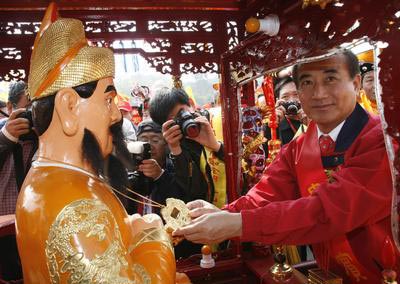 福建閩王王審知的金身,9日在后裔護(hù)駕下“小三通”到金門巡安,為1000多年來的創(chuàng)舉,臺(tái)灣“立法院長(zhǎng)”王金平(右)以裔孫身分敬獻(xiàn)金牌迎駕。臺(tái)灣“中央社”記者倪國(guó)炎攝