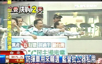 陳水扁的防彈公務(wù)車大咧咧地貼著民進(jìn)黨的競選標(biāo)語。ㄅ_灣TVBS電視臺畫面截圖)