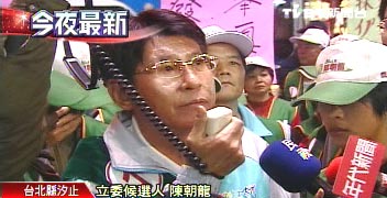 選戰(zhàn)最后一個星期,“立委”候選人使出十八般武藝,爭取媒體報(bào)道。民進(jìn)黨提名的現(xiàn)任“立委”陳朝龍,因?yàn)椴粷M對手李慶華質(zhì)疑他賄選,率領(lǐng)支持者到對方競選總部抗議。