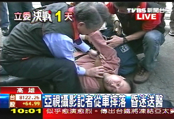 中國(guó)臺(tái)灣網(wǎng)1月11日消息 香港亞視攝影記者李東杰,今天在采訪臺(tái)灣“立委”競(jìng)選活動(dòng)時(shí)不慎從車上摔落,當(dāng)場(chǎng)昏厥,立即被送醫(yī)急救。高雄醫(yī)學(xué)大學(xué)附屬醫(yī)院對(duì)傷者進(jìn)行3個(gè)小時(shí)的開(kāi)腦手術(shù),但傷者仍處于深度昏迷狀態(tài),至少留院兩三日,進(jìn)一步治療。