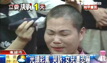 中國(guó)臺(tái)灣網(wǎng)1月11日消息 據(jù)臺(tái)灣TVBS電視臺(tái)報(bào)道,國(guó)民黨“立委”候選人侯彩鳳因?yàn)椴粷M對(duì)手頻頻放出風(fēng)聲,指她買(mǎi)票,在今天做出無(wú)言的抗議,在馬英九及選民面前,剃光頭抗議。