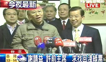 中國臺灣網(wǎng)1月17日消息 據(jù)臺灣TVBS報道,民進黨“立委”選舉大敗,為了“災后重建”,接任黨主席的謝長廷今天拜會前主席許信良,爭取支持。