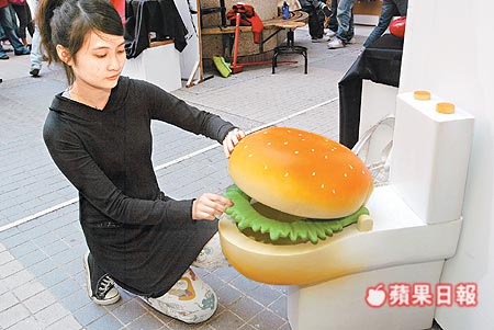 大學生朱育晨以小朋友愛吃的漢堡為發(fā)想,設計出可愛的漢堡馬桶。(臺灣《蘋果日報》圖)