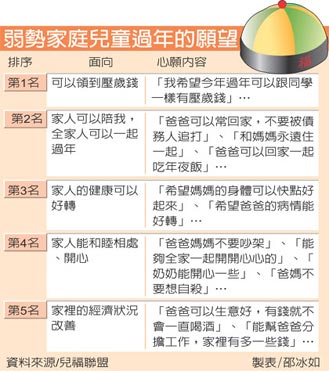 社工也詢問了孩子們的過年心愿,發(fā)現(xiàn)他們的盼望很小很簡單,不過是壓歲錢、全家團圓、身體健康等,卻不易實現(xiàn)。兒盟執(zhí)行長王育敏說,為了協(xié)助這些弱勢的孩子,兒盟今天起發(fā)起“沒你救不行——弱勢家庭兒童脫困基金募集行動”,呼吁各界幫助弱勢家庭籌措今年的年菜和給孩子的壓歲錢。(高大林)