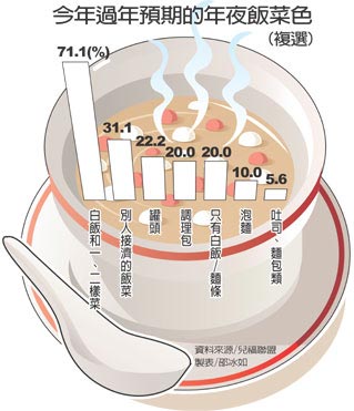 弱勢家庭也大多沒有象樣的年夜飯。兒盟調查發(fā)現(xiàn),81%的弱勢家庭沒錢辦年貨,64%的家庭不敢向親友拜年。當很多人擔心過年吃太好而暴肥時,卻有72%的弱勢家庭今年沒有豐盛的年夜飯可吃,兩成左右只能靠罐頭、調理包、泡面、吐司等果腹,甚至三成左右要靠別人接濟才有飯菜吃。