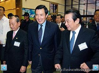 國民黨2008正副參選人馬英九(中)、蕭萬長23日在出席臺(tái)灣六大工商團(tuán)體主辦的臺(tái)灣經(jīng)濟(jì)發(fā)展論壇座談會(huì)。臺(tái)灣東森新聞?dòng)浾咧旒覐⿺z