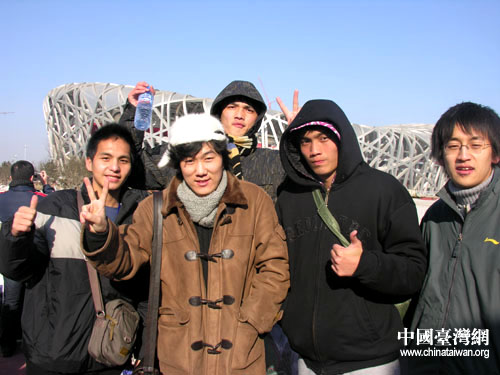 中國(guó)臺(tái)灣網(wǎng)1月23日北京消息 23日是08臺(tái)胞青年冬令營(yíng)開(kāi)營(yíng)后活動(dòng)的第一天。北京的冽冽寒風(fēng)擋不住臺(tái)灣學(xué)子的高漲熱情,面對(duì)奧運(yùn)場(chǎng)館“鳥(niǎo)巢”和“水立方”,臺(tái)胞青年興奮雀躍,驚呼震撼,深感自豪。
