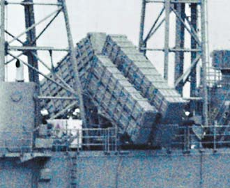 在去年10月10日亮相的“雄風三”型導彈,昨天在導彈巡防艦“成功”艦上曝光。圖中的箱形物體就是“雄三”導彈發(fā)射箱,“雄三”發(fā)射箱和“雄二”(左側(cè))相比,明顯大了一號。