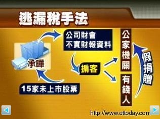 報道說,去年底,親綠媒體三立電視臺總經(jīng)理張榮華才傳出利用臺北縣石碇鄉(xiāng)公所的綠化工程案進行逃漏稅,F(xiàn)在,又被檢調(diào)查出,林、張兩人涉嫌通過專門幫富人逃稅的承曄公司,以低價買入不值錢的股票,再以不實的財報數(shù)據(jù)浮報票面價值,捐贈給學;蜞l(xiāng)公所,造成“假捐贈,真逃稅”。