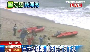 王世堅今天中午身穿潛水衣到三芝鄉(xiāng)淺水灣,在向280位支持者致意并做出聲明后,由助理騎著水上摩托車載到離海岸約100米處跳海,并隨即自行游泳上岸。王世堅上午并以聲東擊西的方式,避開這幾天緊跟他的部分媒體,派出助理到萬里鄉(xiāng)待命。