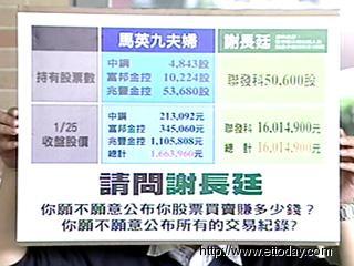 四問謝長廷股票。謝長廷質(zhì)疑馬英九的股票買賣,馬英九在第一時間已公布他的股票持有情形,現(xiàn)在換謝長廷,請他清楚交待股票交易紀錄,聯(lián)發(fā)科買賣的動機、價額,并請他保證自己和家人從來沒有買過聯(lián)發(fā)科以外的股票。(趙靜)