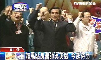 中國臺灣網(wǎng)2月2日消息 據(jù)臺灣TVBS電視臺報道,臺灣2008“大選”候選人馬謝陣營開始大拼場,在臺當局安全單位人員進駐后,要求馬謝雙方各自提供隨行醫(yī)療人員,馬英九身邊的貼身醫(yī)師,今天首度亮相,他就是和馬英九認識30多年的前國民黨“立委”吳英毅。
