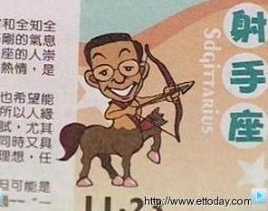 除了封面有意涵,這本農(nóng)民歷里的插圖更有趣。星座運(yùn)勢里的射手座又被稱為人馬座,畫面中的人是謝長廷、底下踩著的是馬,是否有影射什么,讓人有很大的想像空間。