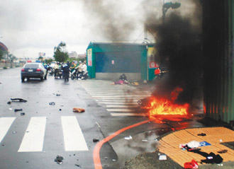 謝菁華遭撞后,整個人彈到數(shù)米外,摩托車起火冒煙,可見撞擊力有多強(qiáng)。(聯(lián)合報圖)