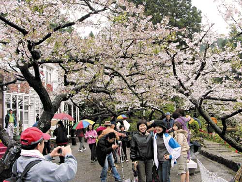 中國臺灣網(wǎng)2月4日消息 據(jù)臺灣《聯(lián)合晚報》報道,島內(nèi)景氣差,造成各風景區(qū)游客驟減,但也有不少新舊景點靠創(chuàng)意、創(chuàng)新,殺出重圍。這幾年來,阿里山森林游樂區(qū)的步道等游憩設施改善,加上新年日出音樂會、櫻花季等活動打響名號,最近幾年游客回升,前年更逼近100萬人次。圖為阿里山回春,游客聚集在櫻花樹下。(周先)