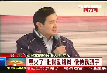 中國臺灣網(wǎng)2月4日消息 據(jù)臺灣媒體報道,在農(nóng)歷新年即將來臨之際,國民黨2008參選人馬英九今天跟網(wǎng)友舉辦了一場見面會,馬英九通過網(wǎng)絡(luò)向網(wǎng)友拜年。見面會上馬英九痛批謝長廷近期的言行就像特務(wù)頭子。