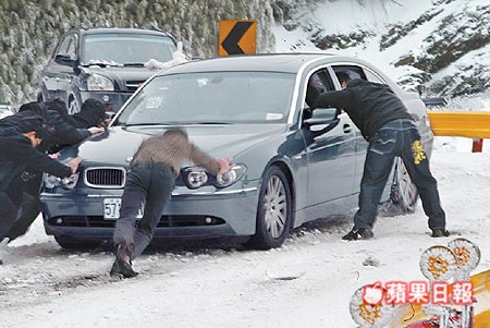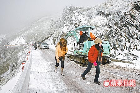 合歡山昨天從鳶峰以上的道路就開(kāi)始出現(xiàn)積雪,太魯閣公園與埔里工務(wù)段雖多次出動(dòng)鏟雪車(chē)清除路面積雪,但因車(chē)輛涌入,再加上鳶峰到武嶺、合歡山莊的道路狹窄,連鏟雪車(chē)都無(wú)法順利通行,不少車(chē)主因欠缺雪地行車(chē)經(jīng)驗(yàn),更發(fā)生車(chē)子打滑擦撞意外,甚至直接撞上山壁。部份駕駛?cè)四筒蛔⌒宰尤我獬?chē),造成交通打結(jié),讓塞車(chē)狀況更為嚴(yán)重,武嶺以下塞車(chē)即長(zhǎng)達(dá)7公里。