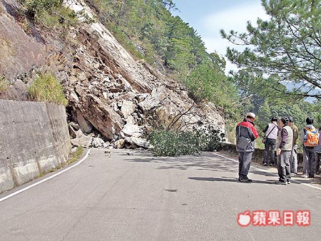 大雪山林道33公里處崩塌,游客下山受阻。(蘋果日報圖)