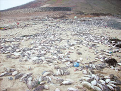 中國臺(tái)灣網(wǎng)2月18日消息 四面環(huán)海的澎湖望安離島,連日來四周海灘布滿了魚尸!疤膳铝耍陌俟唛L的海灘全是魚尸。”望安中學(xué)校長洪嬡慧表示出她的驚駭,她說望安有7個(gè)海灘,只走了2處海灘,情況都一樣嚴(yán)重。