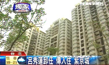中國臺(tái)灣網(wǎng)2月18日消息 據(jù)臺(tái)灣TVBS電視臺(tái)報(bào)道,臺(tái)灣地區(qū)副領(lǐng)導(dǎo)人呂秀蓮,呂秀蓮已經(jīng)買下臺(tái)北縣三峽地區(qū)的一棟百坪住宅“紫京城”,準(zhǔn)備5月20日卸任后入住。