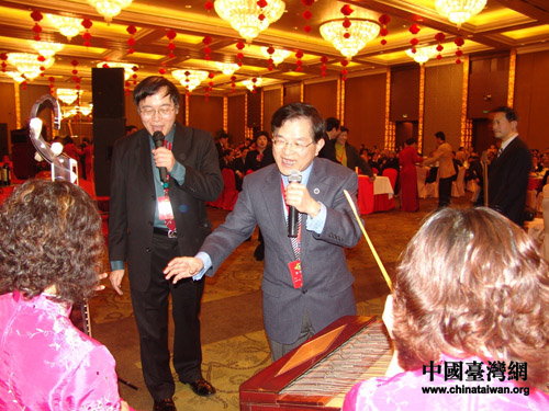 紐約中國和平統(tǒng)一促進(jìn)會(huì)會(huì)長花俊雄和臺(tái)灣中國統(tǒng)一聯(lián)盟主席王津平共同唱起臺(tái)灣民謠《綠島小夜曲》和《望春風(fēng)》。(攝影:鐘寶華)