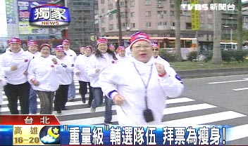 中國(guó)臺(tái)灣網(wǎng)2月19日消息 據(jù)臺(tái)灣TVBS電視臺(tái)報(bào)道,臺(tái)灣2008“大選”在即,候選人馬英九謝長(zhǎng)廷各端牛肉吸引選民,馬英九的“健康政策”就吸引到了一群“重量級(jí)”支持者,他們組成“胖胖后援會(huì)”,呼應(yīng)馬英九的政策,拉票兼減肥。