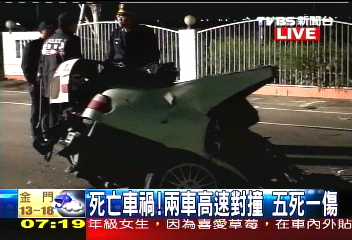 據(jù)臺灣“中廣新聞”報道,臺北縣警方調(diào)查指出,凌晨2點左右,在云林縣云145線北港路段,兩部分別南下北上的小客車,不知何故,發(fā)生對撞,造成這起5死1重傷的重大車禍。