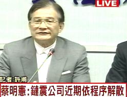 蔡明憲上午剛剛與李天羽完成交接,下午就主動(dòng)到臺(tái)“立法院”拜會(huì)國(guó)民黨團(tuán)。他表示已和臺(tái)當(dāng)局“行政院長(zhǎng)”張俊雄溝通過(guò),鐽震公司將在近期內(nèi)依程序解散。蔡明憲說(shuō),“張‘院長(zhǎng)’(張俊雄)這兩天也很明確指出過(guò),鐽震公司在近期內(nèi)會(huì)解散,它有一定法定公定的程序!