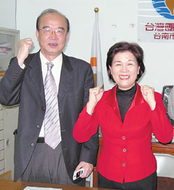 前臺(tái)聯(lián)黨“立委”錢林慧君(右)與擔(dān)任臺(tái)聯(lián)黨中央黨部秘書長(zhǎng)的丈夫錢橙山(左)表態(tài)力挺馬英九。(臺(tái)灣《中國(guó)時(shí)報(bào)》圖片)