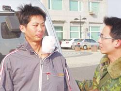 受傷臺軍士兵張光智(左)左手指粉碎性骨折,左小指恐部分截肢,昨天下午緊急送臺北開刀。(臺灣《中國時報》圖片)