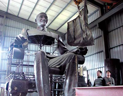 據(jù)報(bào)道,號(hào)稱島內(nèi)最大坐姿的蔣介石銅像,去年3月被高雄市政府大卸成200多塊,昨天修復(fù)的“雛型”在桃園大溪“兩蔣文化園區(qū)”重現(xiàn);但由于碎片實(shí)在太散還是無(wú)法完全重建,藝術(shù)家們便運(yùn)用現(xiàn)代解構(gòu)主義的手法,讓蔣介石坐在鋼架上。大溪鎮(zhèn)公所預(yù)計(jì)下月初就可以修復(fù)完成。