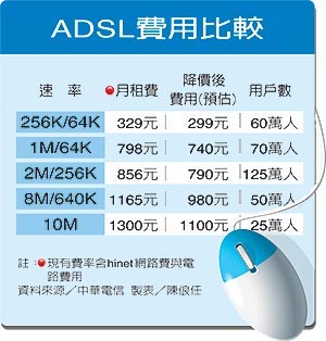 全臺(tái)有480萬ADSL寬帶上網(wǎng)家庭用戶,其中420萬戶是此次降價(jià)受惠者,中華電信占340萬戶左右。另60萬戶有線電視CABLE上網(wǎng)的使用者不在這次降價(jià)范圍內(nèi)。
