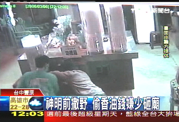 中國臺(tái)灣網(wǎng)3月16日消息 臺(tái)中豐原地區(qū)最近有4間寺廟被偷,行竊過程中,歹徒發(fā)現(xiàn)香油錢太少,很不滿意,竟然當(dāng)場(chǎng)砸東西,還把桌子弄得一團(tuán)亂。殊不知他們作案過程都被監(jiān)視器清楚拍下,廟方開玩笑說,在神明面前撒野,難怪被抓。