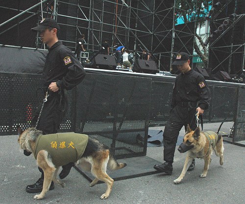3月22日,臺(tái)灣地區(qū)領(lǐng)導(dǎo)人選舉投票日,臺(tái)警方及安全人員拉緊神經(jīng),下午特別到民進(jìn)黨候選人謝長(zhǎng)廷競(jìng)選總部加強(qiáng)檢查,特別還帶了偵爆犬進(jìn)行偵測(cè)。(來源:臺(tái)灣聯(lián)合新聞網(wǎng))