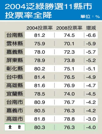 分析各縣市投票率,泛綠優(yōu)勢縣市選民熱情消退,是綠軍大敗的原因。以2004陳水扁呂秀蓮得票超越連戰(zhàn)宋楚瑜的宜蘭縣、臺中縣、彰化縣、云林縣、嘉義市、臺南縣、臺南市、高雄縣、高雄市等11個泛綠優(yōu)勢縣市為例,今年除了高雄市,其余10個縣市的投票率都比2004年減少5至7個百分點,降幅超過全臺灣平均值。其中,陳水扁的故鄉(xiāng)臺南縣,投票率由2004年的81%降為75%,跌幅是濁水溪以南縣市中最高的。