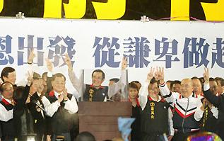 馬英九當(dāng)選后上臺(tái)致詞,接受民眾熱情的歡呼。(東森新聞圖)