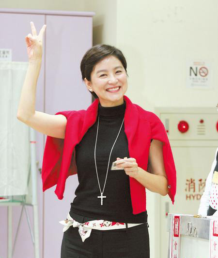 林青霞22日投票后打出“V”的手勢(shì) (臺(tái)灣《中國(guó)時(shí)報(bào)》圖片)
