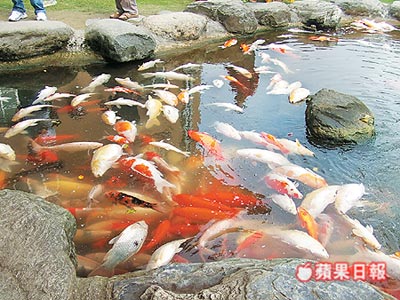 草世紀園區(qū)養(yǎng)的錦鯉大量暴斃翻白肚,魚尸浮滿池面。(圖:蘋果日報)
