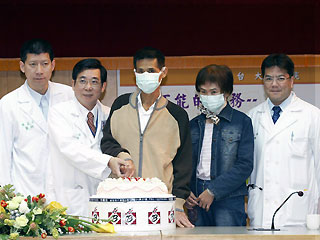 病人陳先生(中)幸運出院,與醫(yī)療團隊切蛋糕慶生。(圖:東森新聞)