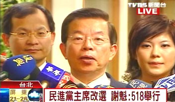 報道稱,民進黨代理主席謝長廷說:“5月18日選舉,5月21日我的計劃就是辦移交,提前辦移交,新的主席就任!敝x長廷并在會中建議,具有民進黨公職身份的人員,不應該來參選新的黨主席,間接否定民進黨秘書長李應元角逐主席的可能性。