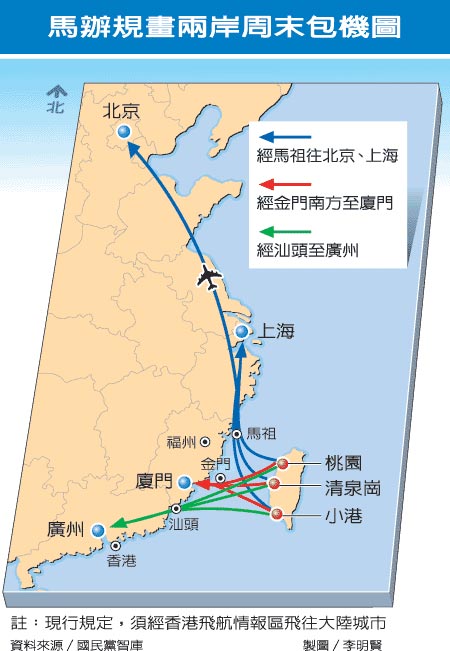 陳世圯指出,馬英九辦公室規(guī)劃北飛上海、北京班機(jī),走馬祖航線飛越海峽中線進(jìn)入上海飛航情報區(qū);往廣州的航班,經(jīng)金門附近由汕頭進(jìn)入廣州,往廈門航班則由金門附近偏南飛行,經(jīng)惠安抵廈門,都不直接經(jīng)過金門上空,舍棄以往繞行香港飛航區(qū)限制;至于進(jìn)入大陸航線如何飛行,仍待兩岸協(xié)商。