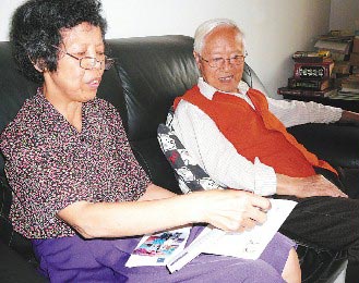 王俊嶸(右)與徐月美(左)夫婦保存著新疆女大學(xué)生唐紅寄來的信,看著她的成績(jī)單,兩人十分欣慰。臺(tái)灣《聯(lián)合報(bào)》記者翁禎霞攝
